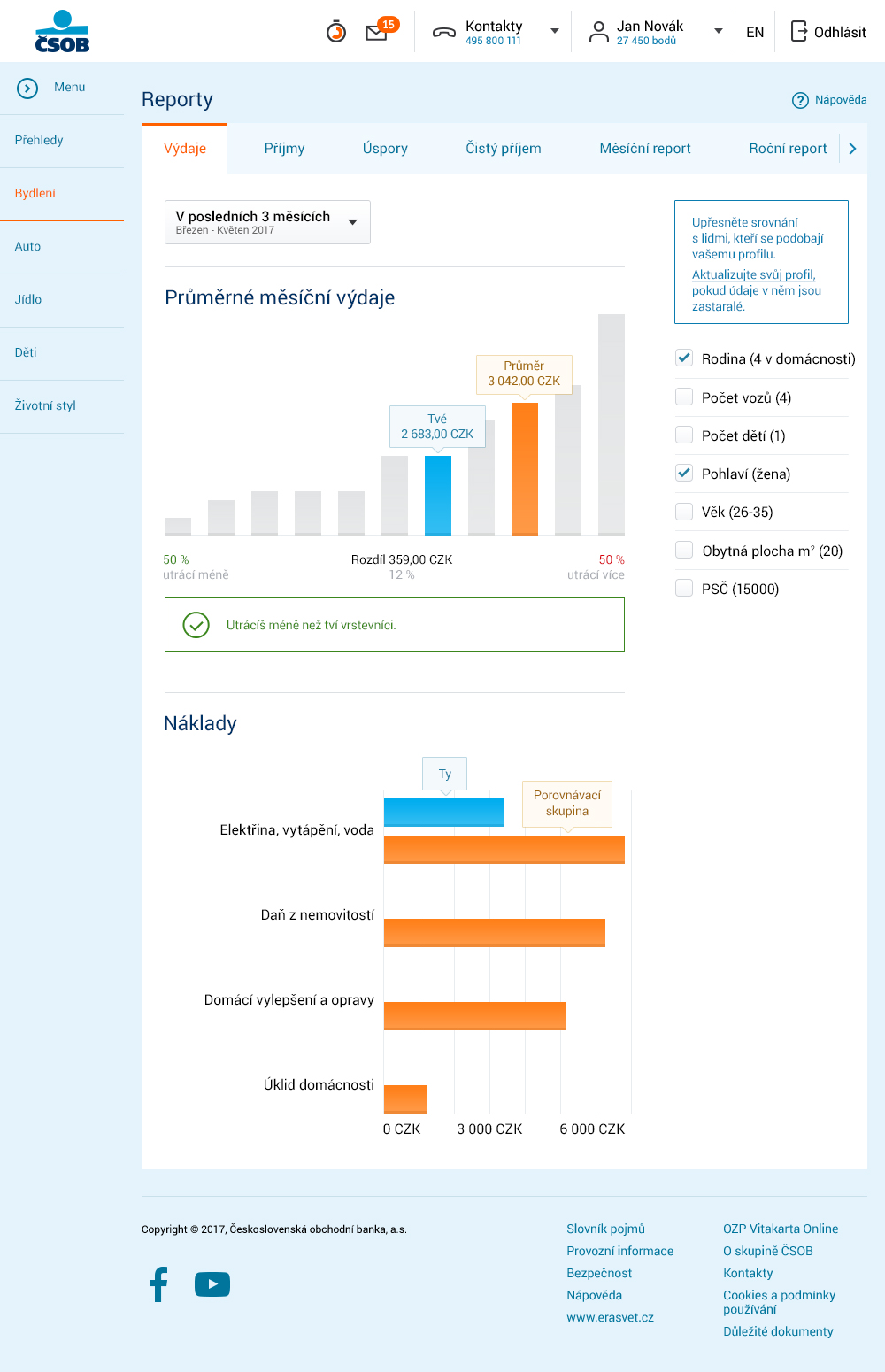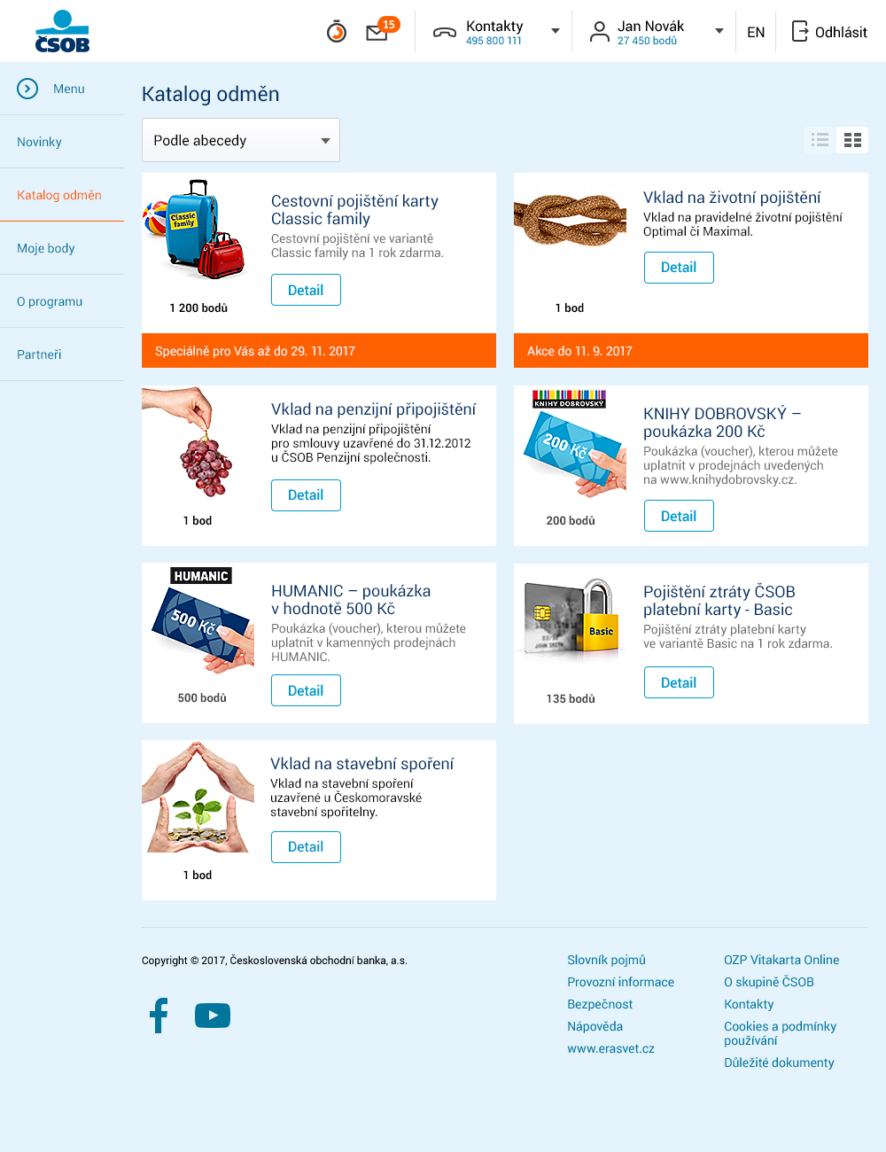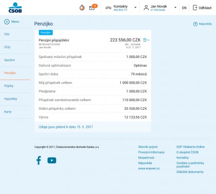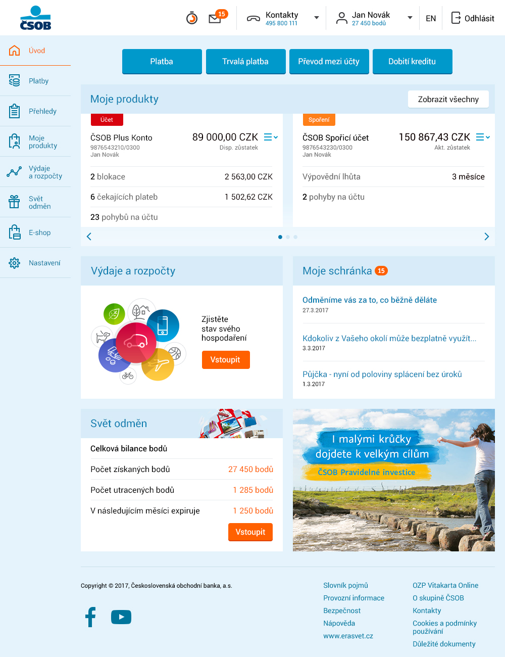 Na úvodní stránce jsou v dlaždicovém přehledu všechny produkty, které klient ve skupině ČSOB používá. Například u běžného účtu má pod dohledem stav zůstatku peněz, blokace a čekající platby. Zároveň vybraný produkt může snadno ovládat, stačí kliknout na ikonku v pravém horní části dlaždice. Kromě produktů jsou do přehledu umístěny i dlaždice s dalšími službami (Moje schránka, Výdaje a rozpočty a Svět odměn). Pokud klient využívá služby některého z našich partnerů, může snadno vstoupit bez dalšího přihlašování do jejich portálů (investic, penzijka či hypotéky). Například v Investičním portálu pak uvidí další podrobné informace o svých investicích a může zde své investice pohodlně spravovat. Tlačítka rychlé volby umístěná na úvodní stránce umožňují využívat nejčastější funkce. Pokud je například potřeba rychle poslat peníze, stačí kliknout na Platbu a dostanete se přímo na formulář. Ve schránce klienti naleznou všechny novinky a důležité zprávy. A zároveň v přehledné složce i všechny elektronické smluvní dokumenty. Novinkou je rovněž služba Rozpočty a výdaje, která usnadní orientaci ve vašich financích. Další novinkou je Svět odměn, věrnostní program, ve kterém klienti sbírají body za to, co běžně dělají. V katalogu odměn si pak mohou vybrat, jaké dárky a výhody chtějí objednat či využít. Více informací na www.svetodmen.cz. |