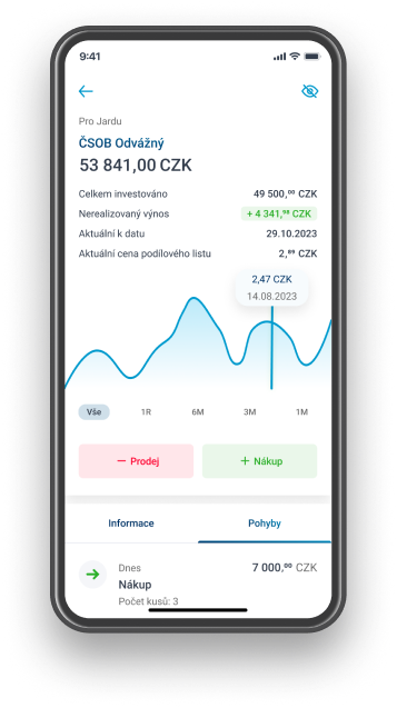 Rozšířený pohled na investice přímo v aplikaci - souhrnný přehled investičních produktů z ČSOB a Patria, s proklikem do Investičního portálu/ do aplikace Patria |