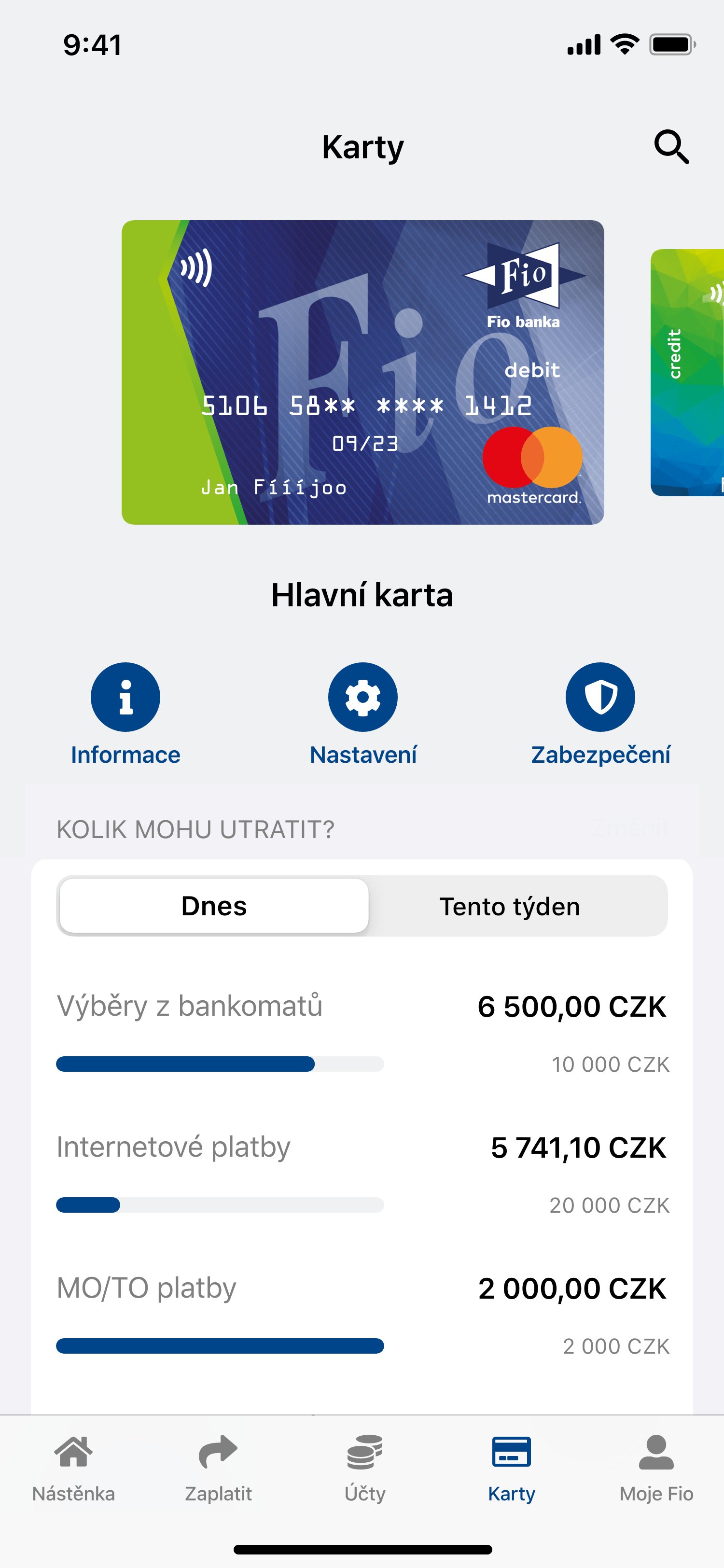 -Možnost změnit limity karty (celkový limit, limit pro bankomat, platbu, internetovou platbu - všechny vždy týdenní i denní). |