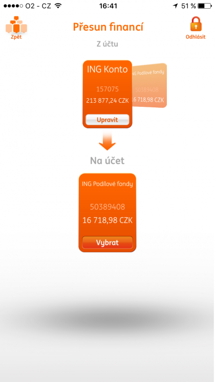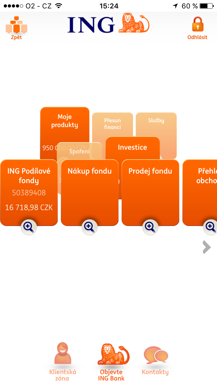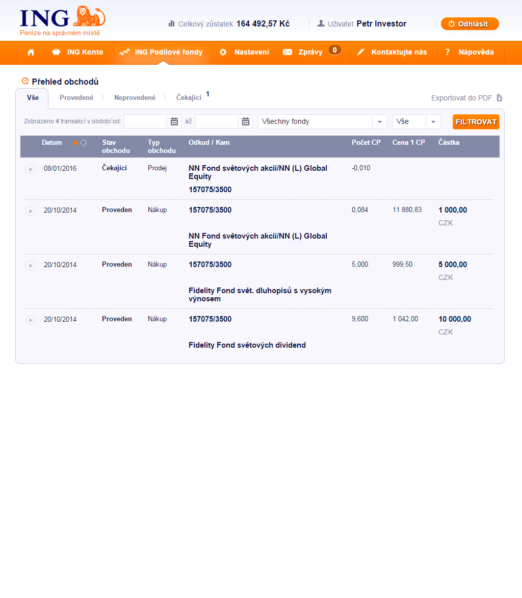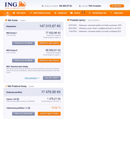 - Okamžitý přehled o vývoji úspor a investic (ihned po přihlášení a po celou dobu je zobrazen stav ING Konta a ING Podílových fondů). |