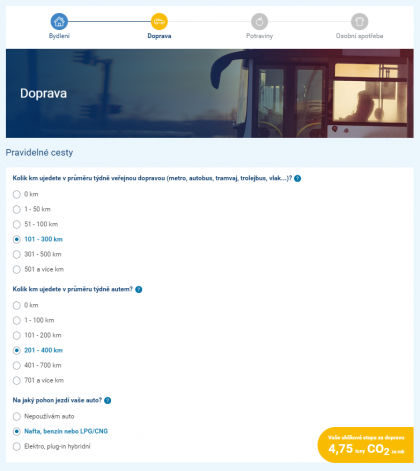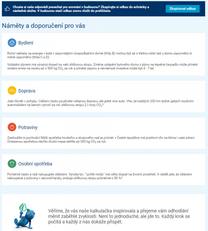 Jednoduchá lifestylová kalkulačka uhlíkové stopy, která hodnotí vliv každodenních a opakujících se činností na klima. K vyplnění nejsou potřeba údaje z faktur či výpisy z účtu – je možné ji vyplnit „z hlavy“. Vyplnění zabere 8 minut a není nutné se registrovat. Celkem 21 otázek je zaměřeno na 4 oblasti spotřeby: bydlení, doprava, potraviny a ostatní spotřeba. Jinými slovy, zaměřuje se na typické největší přispěvovatele spotřeby na osobní uhlíkovou stopu. Časovým měřítkem kalkulačky je jeden rok a jádrem výpočtu je běžný „provoz“ každého z nás. Kalkulačka je dostupná na webu ČSOB. |