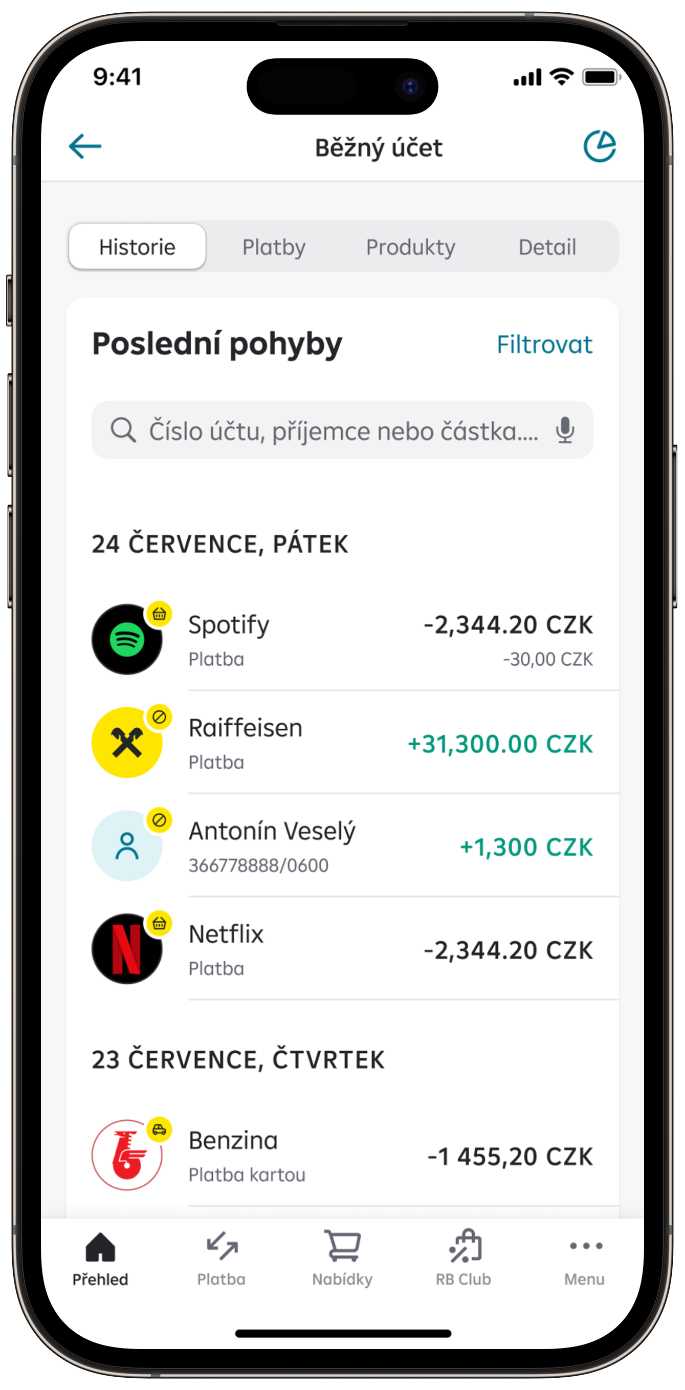 V aplikaci jsou ke stažení k výpisy z běžného účtu |