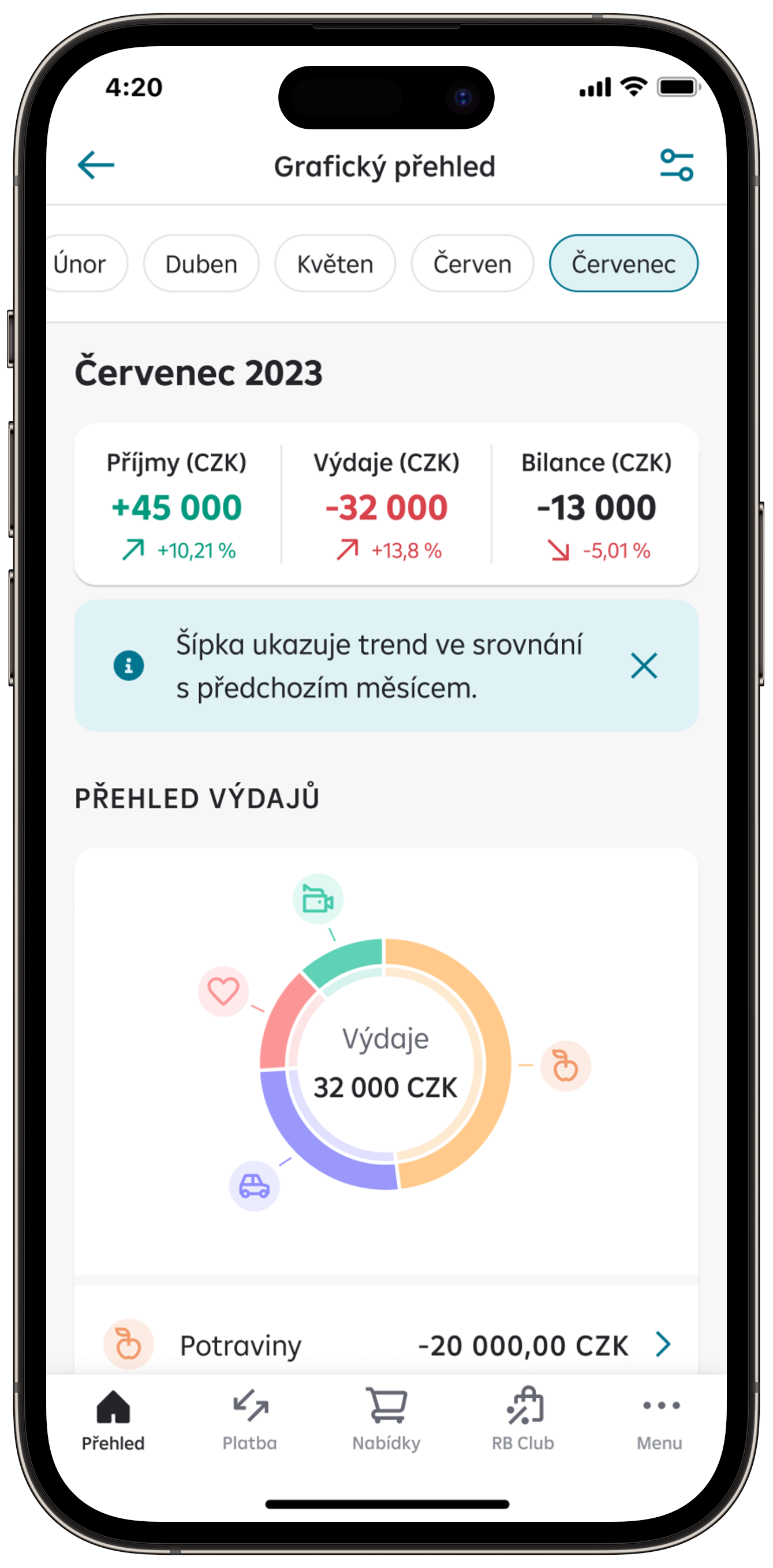 Grafické přehledy výdajů platební kartou (debetní i kreditní) v rozdělení na předem definované kategorie. |