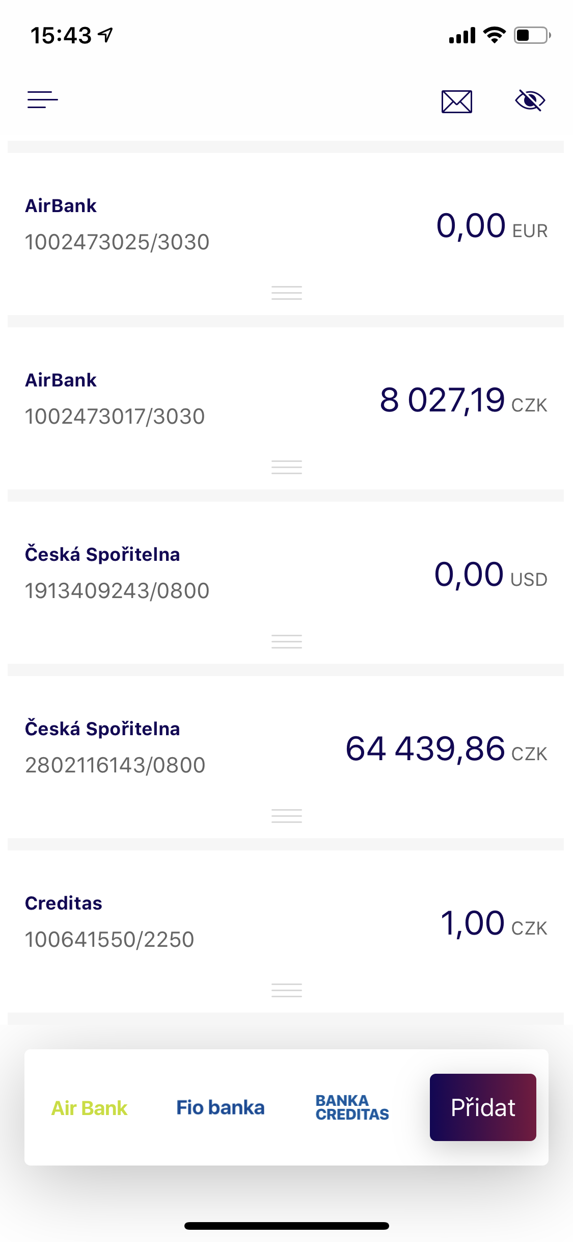 Umožňuje připojit si přes PSD2 API účty u dalších bank, a získat tak přehled o všech svých zůstatcích na jedné stránce. Už nyní připojuje účty od: Díky technologii Screen Scraping lze připojit: V roce 2019 přidáme navíc: |