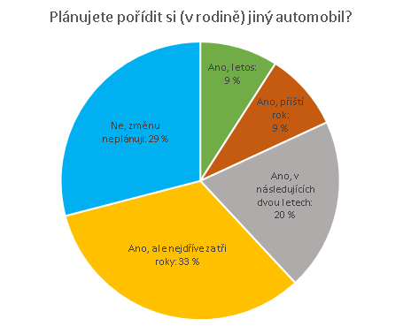 Pořízení zcela nového vozidla zvažuje 40 % dotázaných, ojetinu pravděpodobně zvolí 53 % respondentů. 5 % z nich je navíc rozhodnuto pořídit auto v zahraničí, dalších 15 % o tom uvažuje. Nejčastějším důvodem pro změnu vozidla je jeho stáří a najetý počet kilometrů (51 %). Druhým důvodem je pravidelná obměna vozového parku (18 %). Více než polovina respondentů (53 %) zůstane věrna značce vozidla, které nyní vlastní. Téměř čtvrtina dotázaných (22 %) značku spíše změní.