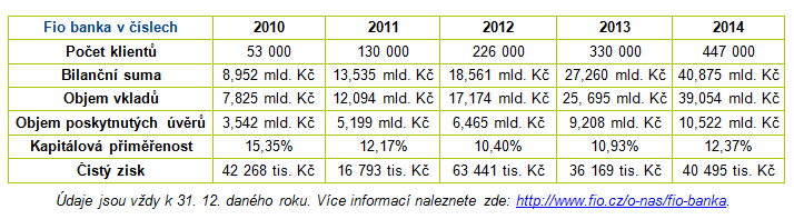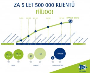 Fio banka slaví 5 let od získání bankovní licence. Během té doby výrazně rozšířila svou nabídku produktů, otevřela 27 nových poboček, vydala více než 350 000 vlastních platebních karet a její klientská základna aktuálně čítá 500 000 klientů. Je tak šestou největší bankou u nás podle počtu klientů.