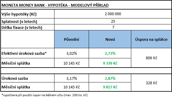 Výrazně ušetřit mohou lidé, kteří si nyní vezmou hypoteční úvěr od MONETA Money Bank. Ta začátkem dubna snížila úrokové sazby o 0,3 % pro fixace na 1, 3, 5 a 7 let, respektive o 0,2 % pro fixaci na 10 let. Zlevnění se týká standardních účelových hypoték s pevnou sazbou, které banka nabízí pod názvem Pružná hypotéka s fixní sazbou. Podmínkou pro získání výhodného úroku je sjednat si volitelné pojištění schopnosti splácet od BNP Paribas Cardif a zároveň dostávat na běžný účet u MONETA Money Bank alespoň 15 000 Kč měsíčně. MONETA Money Bank patří mezi pět největších poskytovatelů nových hypoték v České republice a s milionem klientů je čtvrtým největším finančním ústavem v zemi.