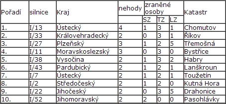 Nově vzniklé nejkritičtější lokality státní silniční sítě v ČR jsou seřazeny v následující tabulce.