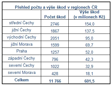Rozmary počasí letos o prázdninách nejvíce pocítili ve středních Čechách, odkud zatím klienti nahlásili 2 746 škod za 154 miliony korun – nejpostiženějším okresem je zde Kladno se 45 miliony korun, následuje Benešov (40 milionů korun) a Rakovník (12 milionů korun). Druhým nejvíce zasaženým regionem, pokud jde o počet škod, jsou východní Čechy (2 051 škod za cca 95 milionů korun). Nejvyšší škody zde klienti hlásili z okresů Chrudim (35 milionů korun), Pardubice (17 milionů korun) a Svitavy (14 milionů korun). Na pomyslném třetím místě se pak umístily jižní Čechy (1 867 nahlášených škod, jejichž hodnota však přesáhla 137 milionů korun). Na jihu republiky eviduje Česká pojišťovna nejvyšší škody v okresech Tábor (59 milionů korun), Strakonice (38 milionů korun) a Jindřichův Hradec (12 milionů korun).