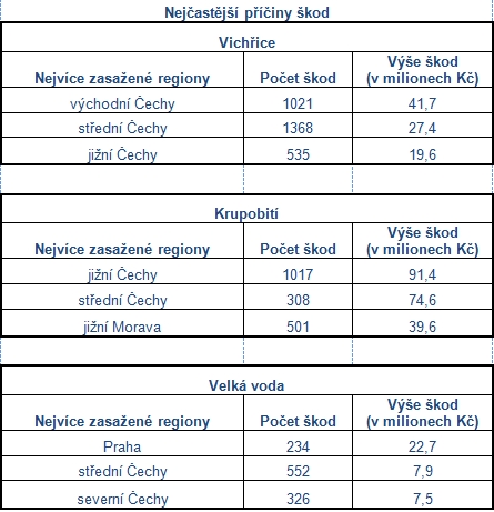 Největší počet škod způsobily o prázdninách vichřice (5070 případů) a rovněž silné krupobití (2590), které s sebou přinesly letní bouřky. S řáděním přírodních živlů se v červenci a srpnu nejvíce potýkali lidé ve středních, východních a jižních Čechách. Z těchto tří regionů je dosud nahlášena více než polovina všech registrovaných událostí. Na nepřízeň prázdninového počasí doplatili také zemědělci, na jejichž majetku napáchaly bouřky škody za více než 230 milionů korun.