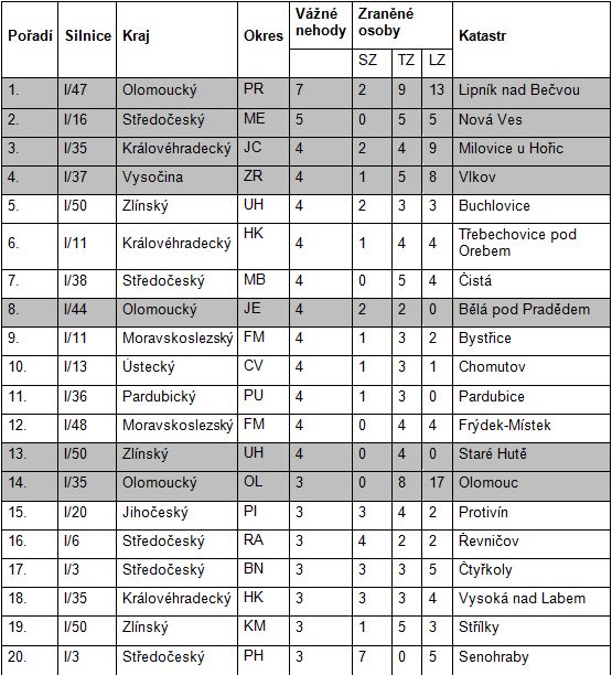Nejrizikovějším místem vůbec se ukázala být křižovatka silnic I/47 a II/637, kam se řidiči dostanou po výjezdu z centra Lipníka nad Bečvou ulicí Na Horecku směrem na městskou část Trnávka, která vede dál na Olomouc. V posledních třech letech se zde stalo sedm vážných nehod. Na druhém místě skončila křižovatka u Nové Vsi ve Středočeském kraji před nájezdem na dálnici D8 ve směru na Prahu, resp. silnice I/16, s pěti vážnými nehodami ve sledovaném období. Na jejím místě jsou dnes již dva kruhové objezdy a zdejší nehodovost by tak měla podstatně klesnout. A jako třetí nejkritičtější místo se do statistik zapsal úsek silnice I/35 v Milovicích u Hořic v Královéhradeckém kraji, a to v několikasetmetrovém pásmu v okolí benzinové stanice při příjezdu do obce směrem od Stračova.