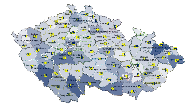 Mapa střetů vozidel se zvířaty podle okresů
