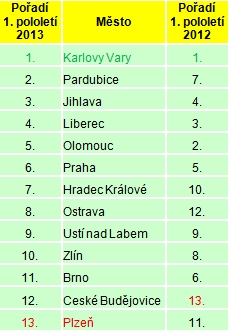Žebříčku krajských měst po prvním pololetí letošního roku, podobně jako v polovině i na konci roku 2012, vévodí Karlovy Vary. Naopak nejméně bezpečné byly v prvním pololetí 2013 dle ČP Indexu silnice v Plzni. Dopravou bez nehody s vážným či smrtelným zraněním se za první pololetí letošního roku může pochlubit hned dvacet okresních měst, což je nový rekord. Nejhůře z okresních měst přitom dopadlo Ústí nad Orlicí. Během prvních šesti měsíců roku 2013 zde na 14,5 tisíc obyvatel připadly čtyři těžké dopravní nehody.