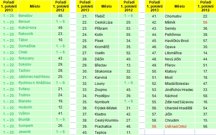 Tabulky níže: Pořadí krajských a okresních měst dle ČP Indexu bezpečnosti v 1. pololetí 2013
