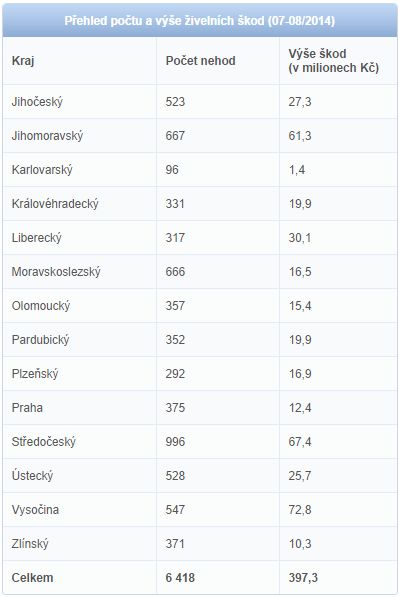 S řáděním přírodních živlů se v průběhu prázdnin potýkali nejvíce lidé ve Středočeském, Jihomoravském a Moravskoslezském kraji. Nejméně naopak pocítili sílu přírody v kraji Karlovarském. Drtivá většina registrovaných škod (více než 5 400) spadá do oblasti pojištění majetku občanů, na nepřízeň prázdninového počasí však doplatili také zemědělci. Těm škodilo zejména krupobití, které o prázdninách poničilo více než 55 tisíc hektarů porostů.