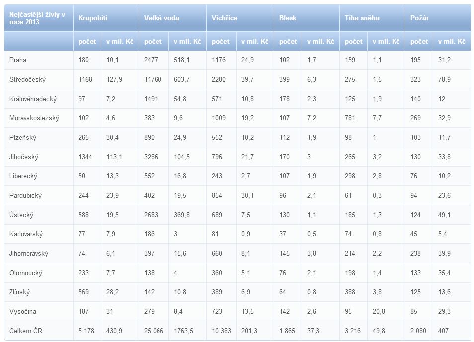 Jak ukazuje následující tabulka, v roce 2013 škodily na území ČR i další přírodní živly, jako např. blesky či oheň. Česko potrápil také sníh, a to i přesto, že se letošní zima zdála velmi mírná. Řádění živlů vloni nejvíce postihlo Středočeský, Jihočeský a Ústecký kraj, naopak nejméně živelních škod zaznamenala Česká pojišťovna v roce 2013 v krajích Karlovarském, Olomouckém a Libereckém. Zejména kvůli povodním došlo vloni k 62% meziročnímu nárůstu hlášených živelních škod, jejichž objem vzrostl v porovnání s rokem 2012 o 36 %.