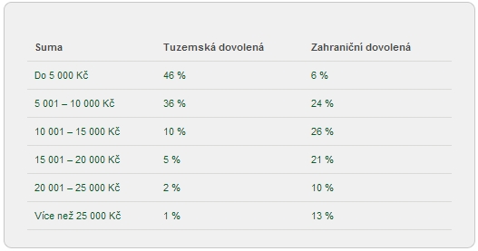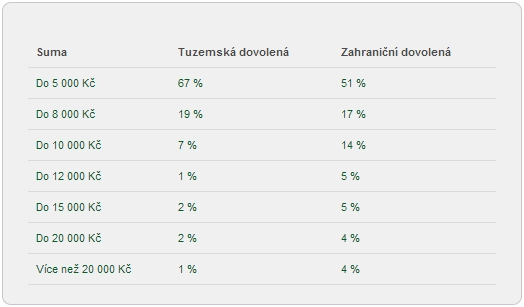 V místě zahraničního pobytu utratí polovina lidí v přepočtu na osobu do 5 tisíc korun, přibližně každý třetí až do 10 tisíc korun, 18 procent respondentů pak více. V Česku utratí do 5 tisíc korun dvě třetiny dotázaných, do 10 tisíc korun každý čtvrtý, více pak jen 7 procent lidí.