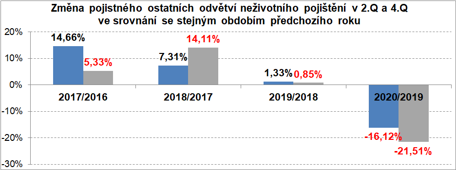 K vývoji v segmentu neživotního pojištění Jaroslav Urban z ČAP uvádí: „Neživotní pojištění i v roce 2020 potvrdilo růstový trend (s výjimkou ostatních odvětví mimo pojištění vozidel, majetku a odpovědnosti občanů i podnikatelů, kde se projevil pokles v předpisu pojistného ve 2. a 4. čtvrtletí o desítky procent, a to v souvislosti s omezením cestování i s dalšími ekonomickými restrikcemi), když předepsané pojistné v celém neživotním pojištění stouplo za rok 2020 o 3,9 %,“ a dodává: „Ve srovnání s rokem 2019 tak posílilo o 3,52 mld. Kč a aktuálně dosahuje hodnoty 94,67 mld. Kč místo loňských 91,15 mld. Kč.“