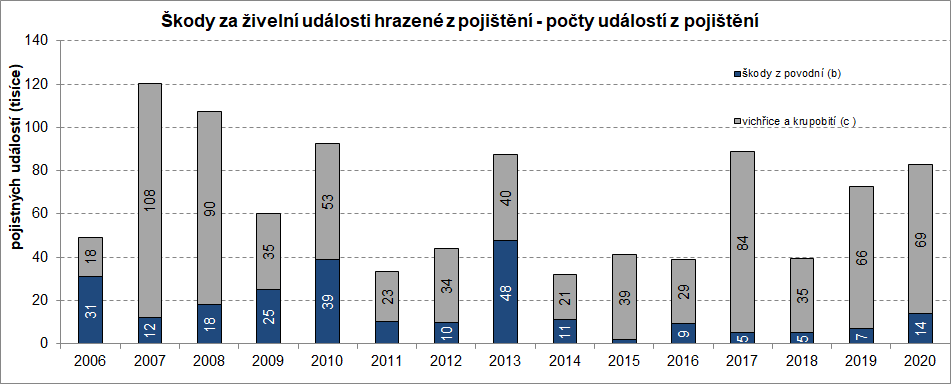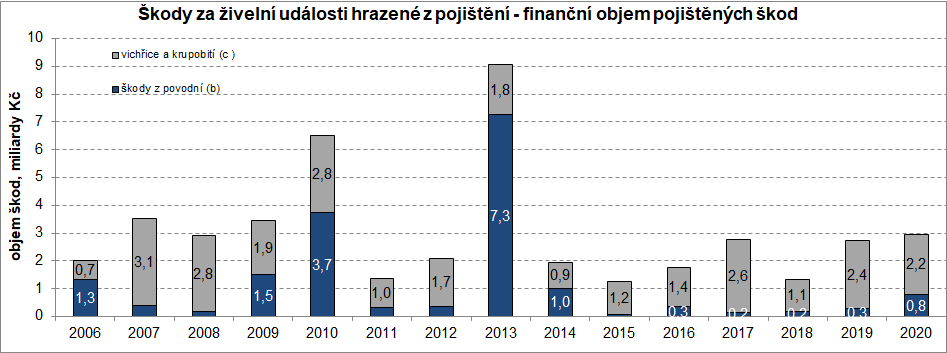 V roce 2020 řešily pojišťovny téměř 83 000 pojistných událostí na majetku způsobených povodněmi, vichřicemi nebo krupobitím, a to v úhrnné výši cca 2,96 mld. Kč. Ve stabilních letech, kdy se nevyskytují jednotlivé mimořádné události, řeší pojišťovny v průměru 38 000 těchto událostí ročně a výše škody dosahuje hodnoty 1,6 mld. Kč. Výsledky roku 2020 překračují tento průměr o 117 % pro počty řešených pojistných událostí a o 82 % u výše škody.