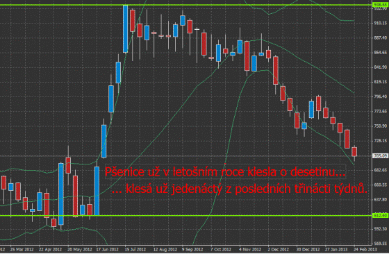 Pšenice obchodovaná v Chicagu stále hledá své letošní dno. Dnes se obchodovala pod 7 dolarů za bušl a od počátku roku už ztratila více než desetinu. Nachází se na nejnižších hodnotách od druhé poloviny června 2012, kdy se do její ceny zakouslo rekordní sucho na americkém středozápadě. Za poklesem ceny stojí silné sněžení v pěstitelských oblastech, které rozptyluje obavyz pokračování sucha a poškození zimních variant pšenice.
