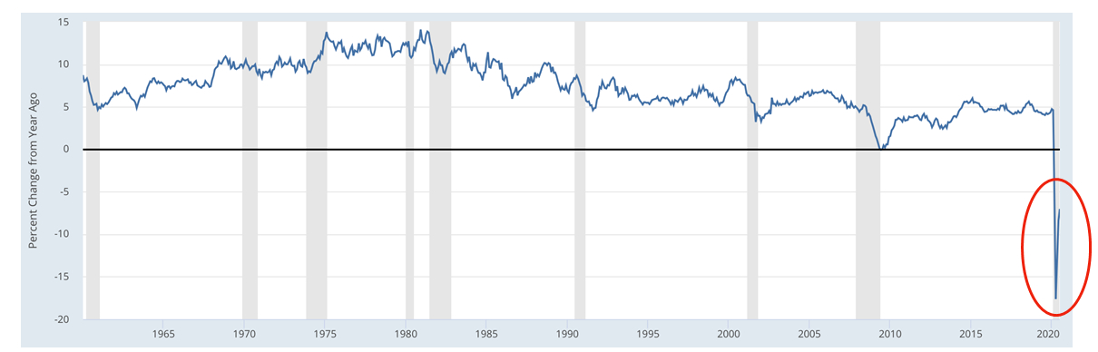 Kvůli uzavírání ekonomik utrpěl především sektor služeb. Obrázek níže ukazuje meziroční růst výdajů, které americké domácnosti utrácely za služby. Vidíme, že i když výše výdajů kolísá, od roku 1960 se vždy jednalo o kladný růst. Dokonce i v roce 2009, kdy probíhala finanční krize, utratili Američané za služby více než v roce předchozím. Změna přišla až letos. Poprvé za posledních 60 let se tempo růstu přehouplo do záporných hodnot. Důvod je zřejmý – uzavření ekonomiky, chcete-li lockdown.