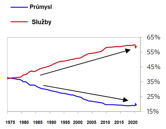 Sektor služeb se ze dvou třetin podílí na tvorbě amerických pracovních míst. Pokud byste chtěli vidět příklad grafu, který ukázkově zobrazuje rozevírající se nůžky, podívejte se na srovnání podílu pracovních míst ve službách a v průmyslu. Zatímco posledních 45 let „služby“ stabilně rostou, „průmysl“ jde opačným směrem. Letos na těchto křivkách ale uvidíme zlomy, které přerušily dlouhodobý trend. Zatímco u služeb je znatelný propad, podíl průmyslu na tvorbě pracovních míst naopak vzrostl.