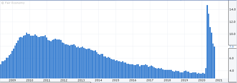 A jestliže se propadnou výdaje na služby, které tvoří dvě třetiny pracovních míst, je logické, že to ovlivní i míru nezaměstnanosti. Ta na jaře raketově vystřelila i nad úrovně, které jsme zažili při poslední krizi, což ukazuje další graf.