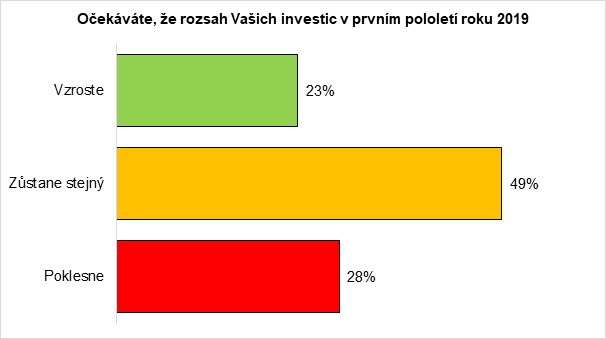 Hospodářská komora proto se znepokojením konstatuje, že výrazně vzrostl počet firem, které letos zvažují odložit realizaci svých investičních rozhodnutí. Z výsledků pravidelného komorového šetření realizovaného na přelomu letošního ledna a února vyplývá, že investiční rozhodnutí bude oddalovat 28 % firem, s nárůstem investic oproti druhé polovině roku 2018 počítá jen 23 % firem. Celá polovina podnikatelů plánuje pokračovat v investicích stávajícím tempem.
