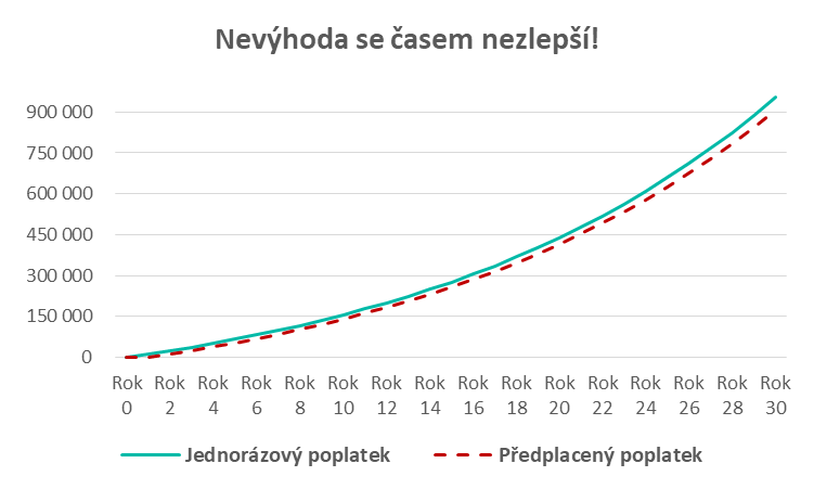 - Předplacený poplatek ve výši 12 600 Kč se nevrátí = po 5 letech poplatek vychází na 21 %.