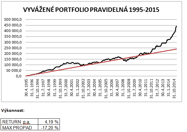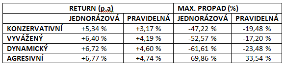 4) Nic není zadarmo. Vyšší výnosy jsou vždy spojeny také s vyššími hodnotami maximálních propadů, které nemusí být pro každého investora stravitelné. Výjimka u hodnoty maximálního propadu pravidelné investice do vyváženého portfolia může být náhodou nebo také potvrzením toho, že vyšší diverzifikace může poklesy hodnoty portfolia skutečně mírnit.