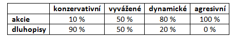 Zkoumaná portfolia jsem pro jednoduchost složil jen ze dvou součástí. Akciového indexu MSCI World a celosvětového dluhopisového indexu Barclays Aggregate Bond Treasury. Alokaci těchto dvou indexů do jednotlivých portfolií ukazuje tabulka a výsledky jsou přepočítány do českých korun. Data obsažená v grafech i tabulkách vygeneroval Morningstar a nejsou nijak upraveny.