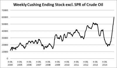 Obr. 2: Zásoby ropy v Cushingu (zdroj eia)