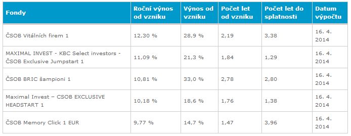 Průměrný výnos zajištěných a strukturovaných fondů ČSOB před splatností dosahuje od svého vzniku hodnoty 4,75 % ročně (odpovídá 5,58 % na depozitech před zdaněním). Nejvyšší roční výnos od vzniku si na konci března připsal fond ČSOB Vitálních firem 1 – 12,30 %. Nejvyšším absolutním výnosem od svého vzniku se pyšní Maximal Invest – ČSOB Evropský lookback 1, a to 53,2 %. Absolutního výnosu od vzniku přes 40 % dosahuje ještě ČSOB Světový lookback 3. Navíc další čtyři fondy přesahují 10 % výnosu ročně od svého vzniku. Všechny tyto výsledky dokazují, že strukturované a zajištěné fondy jsou správnou volbou při tvorbě investiční části portfolia.