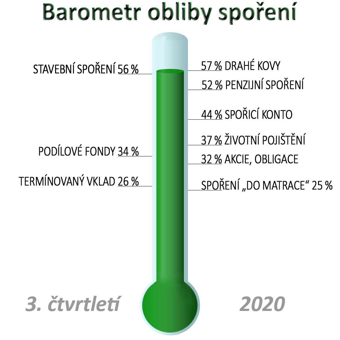 Nejvíce si podle Čechů polepšily penzijní spoření a podílové fondy, a to shodně o čtyři procentní body. U možnosti spořit formou termínovaných vkladů se atraktivita však mezikvartálně nezměnila. Spořicí konto, životní pojištění a spoření do matrace vzrostly o jeden procentní bod. Z průzkumu je patrné, že zájem o spoření v celkovém součtu mezikvartálně roste.