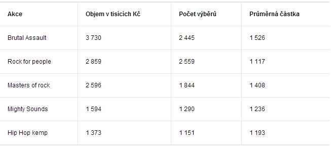 Návštěvníci hudebních festivalů a dalších letních akcí si z Era mobilního bankomatu vybrali hotovost o celkovém objemu přesahujícím 16,5 milionu korun. Průměrná výše jednoho výběru činila 1 397 korun. Suverénně nejúspěšnější akcí byl stejně jako loni metalový festival Brutal Assault, na kterém bylo provedeno 2 445 výběrů o celkovém objemu 3,73 mil. korun.