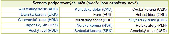 Novými světovými měnami, v nichž je možné založit Fio účet, je švýcarský frank, norská, švédská a dánská koruna, chorvatská kuna, ruský rubl, australský a kanadský dolar a japonský jen. Tabulka měn, v nichž Fio banka nyní nabízí účty, je uvedena níže. V podporovaných měnách je možné posílat a přijímat platby zdarma nebo za nízké poplatky, a to i z účtů nebo na účty např. v korunách, kde bude platba odepsána nebo připsána s přepočtením dle aktuálního kurzu uvedeného v kurzovním lístku.