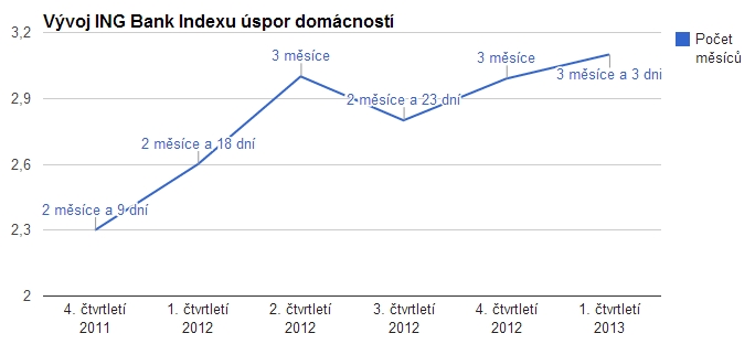 Úspory českých domácností oproti poslednímu čtvrtletí loňského roku opět narostly. Podle dlouhodobého průzkumu ING Bank Svět spoření je trend zvyšujících se úspor sice pozvolný, ale stabilní. Průměrná česká domácnost by tak v prvním čtvrtletí 2013, v případě, že by přišla o všechny příjmy, dokázala vydržet se svou finanční rezervou tři měsíce a tři dny. To je sice o pouhé tři dny déle než v posledním čtvrtletí 2012, ale téměř o měsíc více než ve stejném období roku 2012. Domácnosti jsou také schopny spořit více než v předcházejících měsících. Pokud by chtěly, dokázaly by odložit stranou až 25 % svých příjmů.