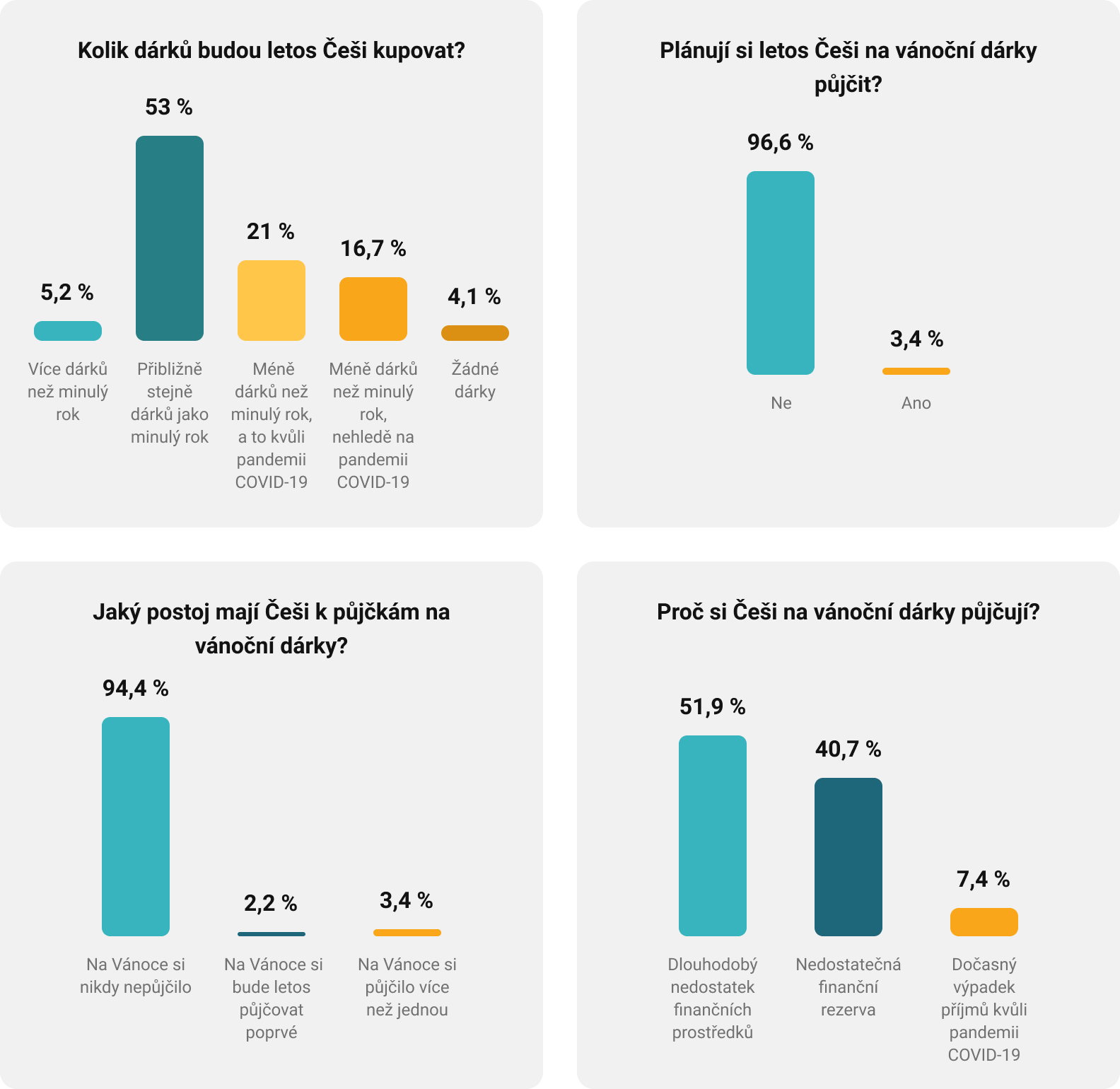 Oproti minulému roku, kdy se k vánoční půjčce plánovalo uchýlit více než 8 % Čechů, představuje letošní číslo pokles o 5 procentních bodů. Výsledky také ukazují, že na Vánoce si nikdy nepůjčilo více než 94 % dotázaných a že přes 2 % Čechů si na Vánoce bude letos půjčovat poprvé. Ostatní dotázaní (3,4 %) uvedli, že si na dárky v minulosti půjčili více než jednou.