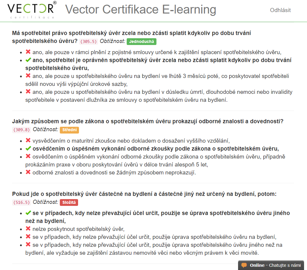 Úspěšnost jednotlivých otázek je rozdělena do 3 segmentů: složitá, střední a jednoduchá. Takže nejnáročnější otázky, tak jak je uživatelé zodpovídali při samostudiu, jsou označeny červeně, středně obtížné oranžově a jednoduché otázky zeleně. Pracovně nazýváme tuto funkci „semafor“.