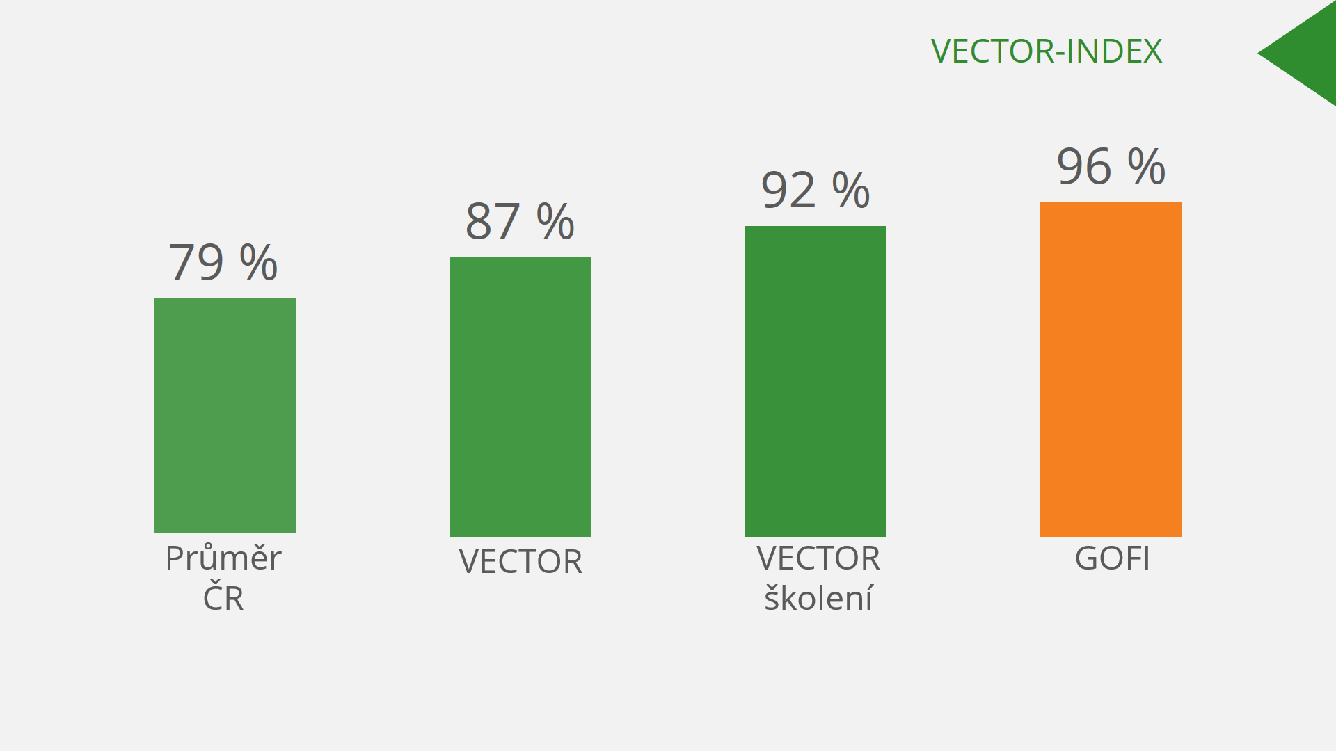 V průběhu roku 2017 proběhlo prozkoušení celkem 171 poradců, kteří se zúčastnili souhrnné zkoušky na spotřebitelský úvěr (180 min). V této souvislosti jsme porovnali úspěšnost poradců z Golemu vzhledem k ostatním účastníkům stejných zkoušek. Tímto způsobem vznikl VECTOR-INDEX pro GOLEM FINANCE. Výsledky jsou znázorněny graficky níže.