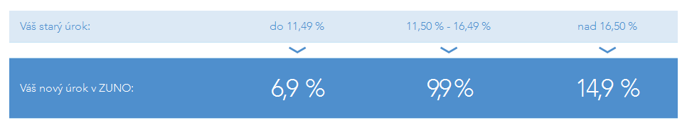 Online banka Zuno, jediná banka bez fyzických poboček v Česku a na Slovensku, přichází s garantovanou nabídkou sníženého úroku při refinancování nevýhodné půjčky. Výměnu lze provést zcela online, bez návštěvy pobočky a bez nesmyslných poplatků.