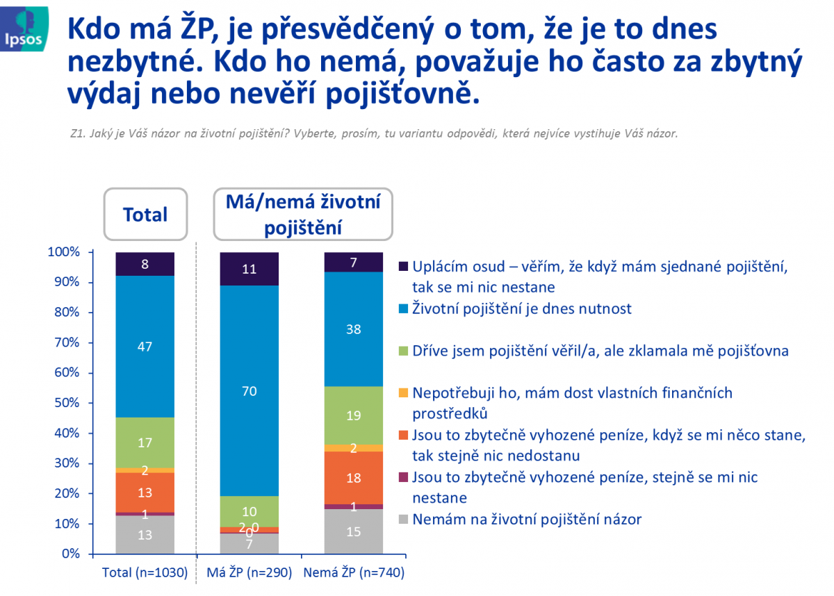 Téměř třetina dotázaných uvedla, že má životní pojištění, a dvě třetiny z nich jsou přesvědčeni, že je to dnes nutnost. Každý desátý uplácí osud – věří, že se mu nic nestane, když si pojistku sjednal. Do skupiny lidí, kteří pojišťovnám příliš nedůvěřují, patří hlavně lidé nad 60 let a osoby se základním vzděláním a s nižšími příjmy.