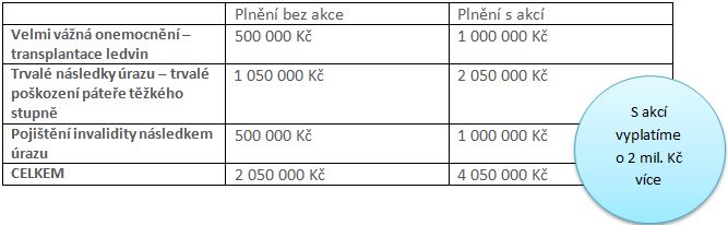 Klient si sjedná 15. 5. 2014 novou smlouvu s pojištěním invalidity z důvodu úrazu, velmi vážných onemocnění a s trvalými následky úrazu. Každé riziko na pojistnou částku 500 000 Kč. Po půl roce má těžkou dopravní nehodu, následkem které potřebuje transplantaci ledvin. Trvale si poškodí páteř a je uznán plně invalidním.