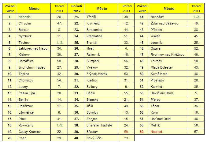 Žebříčku bezpečnosti 13 krajských měst nově vládnou Karlovy Vary, které se také staly skokanem roku. Postavení si oproti předchozímu roku znatelně vylepšil také Zlín (z 12. na 6. místo) a Ústí nad Labem (z 13. na 8. místo). Naopak v posledních letech velmi úspěšná Plzeň (1. místo v roce 2011 a 2. místo v roce 2010) si meziročně nejvýrazněji pohoršila a propadla se až na předposlední 12. místo. Podobně je na tom i Jihlava (1. místo v letech 2009 a 2010 a 3. místo v roce 2011), která byla vloni desátá. Úplně poslední pak v žebříčku bezpečnosti za rok 2012 skončily České Budějovice.
