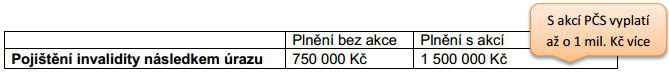 Pojišťovna České spořitelny přichází v letošním roce již s třetí akcí podobného charakteru. Předchozími dvěma kampaněmi pojišťovna podpořila sjednání rizik velmi vážných onemocnění a trvalých následků způsobených při dopravní nehodě. Nyní upozorňuje na podceňované riziko invalidity a do 30. 11. 2014 motivuje klienty, aby se na něj pojistili za zvýhodněných podmínek. Když se v důsledku úrazu stanou plně invalidními, dostanou dvojnásobek sjednané pojistné částky, maximálně o jeden milion více.