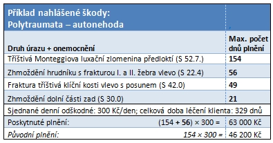 Dojde-li při jednom úrazu současně k minimálně třem poraněním, z nichž každé je v tabulkách denního odškodného ohodnoceno maximální hodnotou plnění 42 dnů a více, vyplatí Pojišťovna České spořitelny pojistné plnění za skutečnou dobu léčení, maximálně však za počet dnů, který se stanoví podle tabulek jako součet maximálních hodnot plnění denního odškodného pro dvě nejzávažnější poranění vzniklá při úrazu.