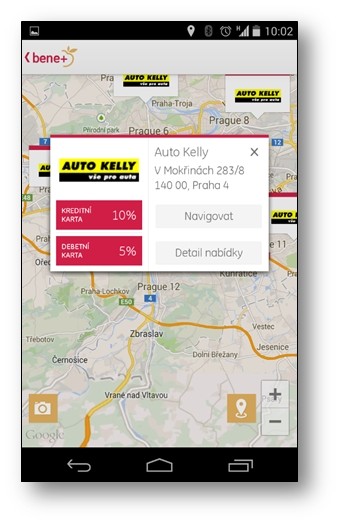 Mapa spolupracujících obchodníků (více než 1.800 poboček) včetně Augmented reality, možnost generovat kupony přímo v aplikaci, přístup k datům i v offline režimu, rychlé vyhledávání/filtrace, navigace k vybraným pobočkám |