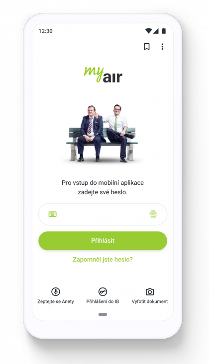 Klienti se mohou přihlašovat do aplikace buď biometrickým prvkem (otisk prstu, sken tváře), nebo přihlašovacím heslem. Po třetím neúspěšném pokusu o přihlášení dochází k automatickému zablokování aplikace. Aplikaci může klient sám odblokovat buď přímo v aplikaci (vícefázovým ověřením), ve svém internetovém bankovnictví, může také zavolat na kontaktní centrum banky, kde mu s odblokováním aplikace pomohou. Pokud klient zapomněl heslo jak do My Air, tak do internetového bankovnictví, může si dojít na pobočku, kde ho na základě dokladů totožnosti ověří a pomohou změnit hesla a znovu se do aplikace dostat. |