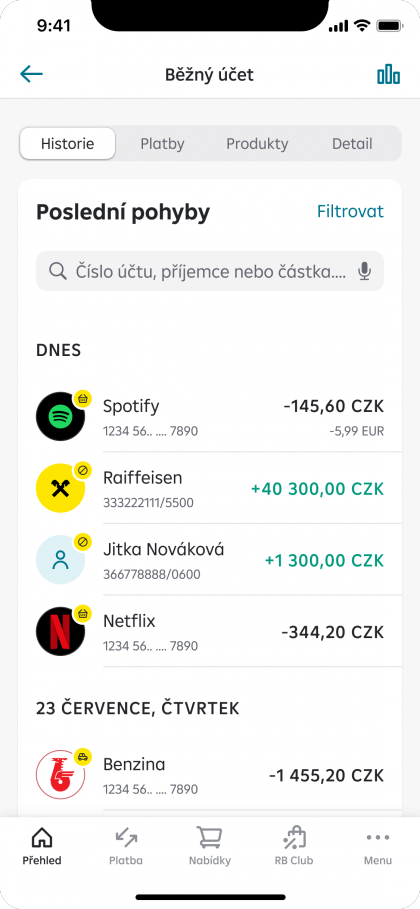 Aktivní operace jsou potvrzovány také pomocí S-PINu. Ten se zadává přímo na bankovní server, a proto ho není možné zpětně nikde v telefonu nebo tabletu dohledat (ochraně S-PINu jsme věnovali maximální pozornost). Navíc se po 5 chybných pokusech o zadáních S-PINU aplikace zablokuje (následně je potřeba provést novou aktivaci). Tuzemské platby do výše 5000 Kč lze potvrzovat také pomocí biometrie (otisk prstu na zařízeních s OS Android, Touch ID nebo Face ID na zařízeních s iOS). |