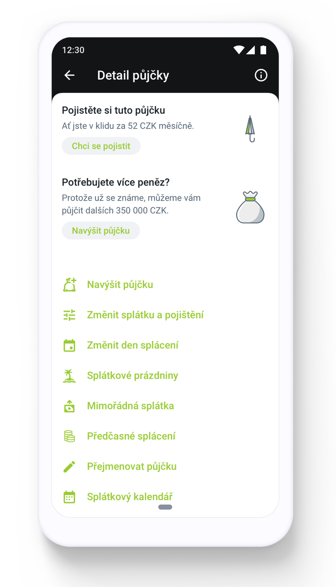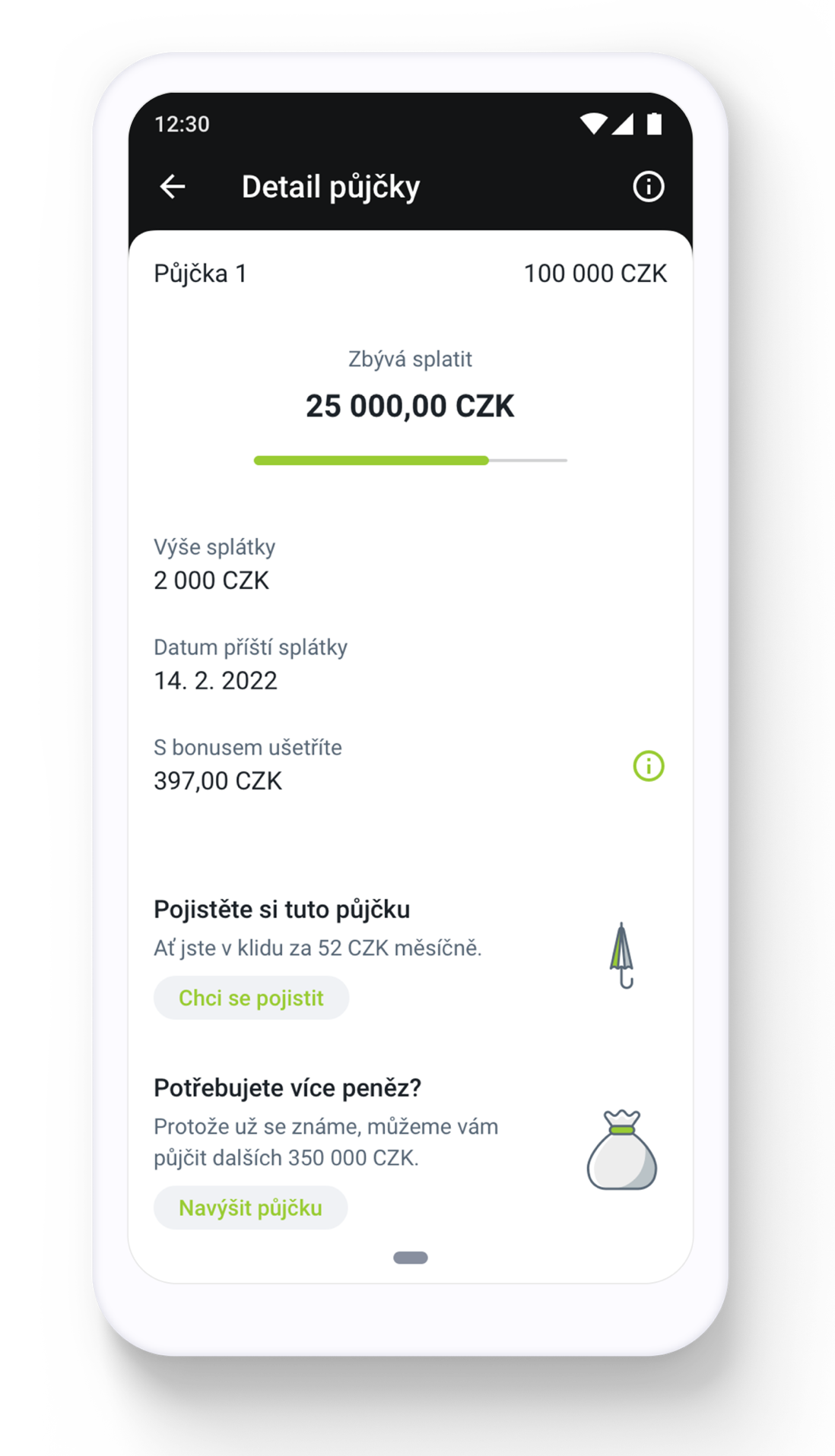 Pravidelné měsíční splátky s možností kdykoliv provádět mimořádné splátky a také půjčku kdykoliv předčasně splatit. |